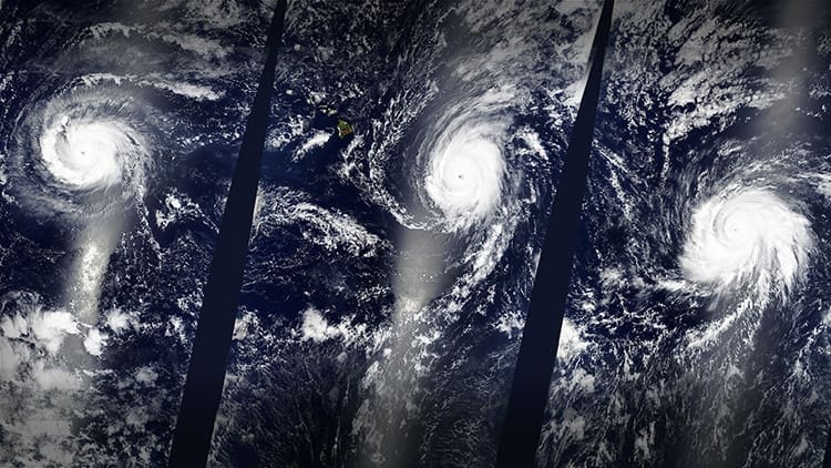 La NASA ha captado una imagen de un extraño fenómeno meteorológico: por primera vez desde que existen registros tres huracanes de categoría 4, bautizados como Kilo,...