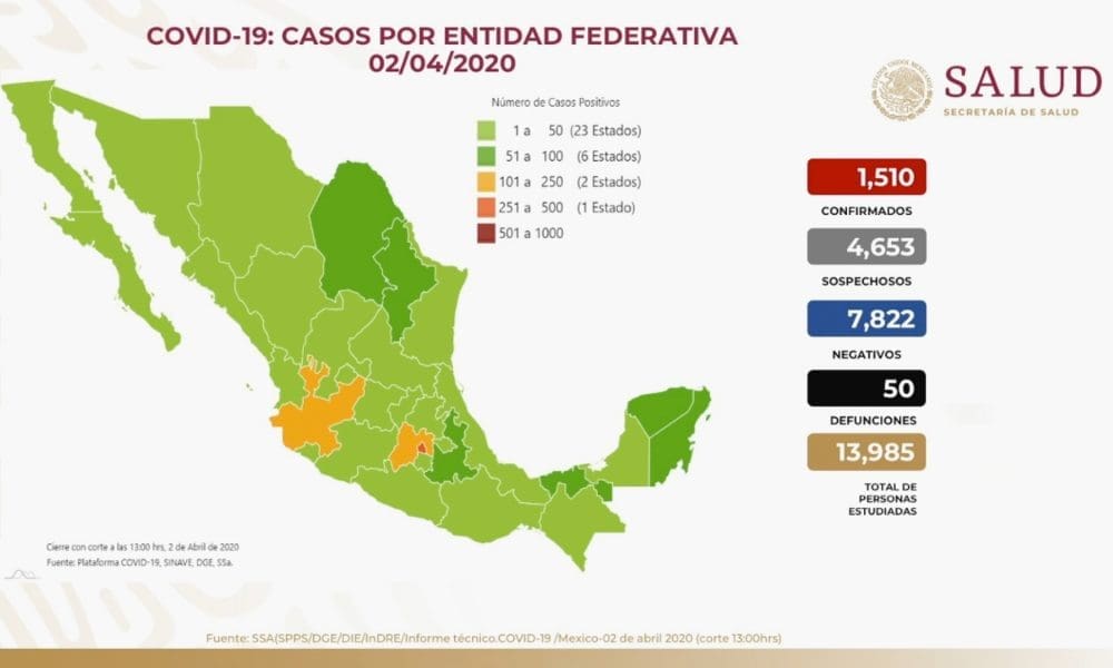Al día de hoy, México confirmó 1,510 casos positivos, 4,653 casos sospechosos, 7,822 casos negativos y 50 defunciones. El 81% han sido no graves y solo...