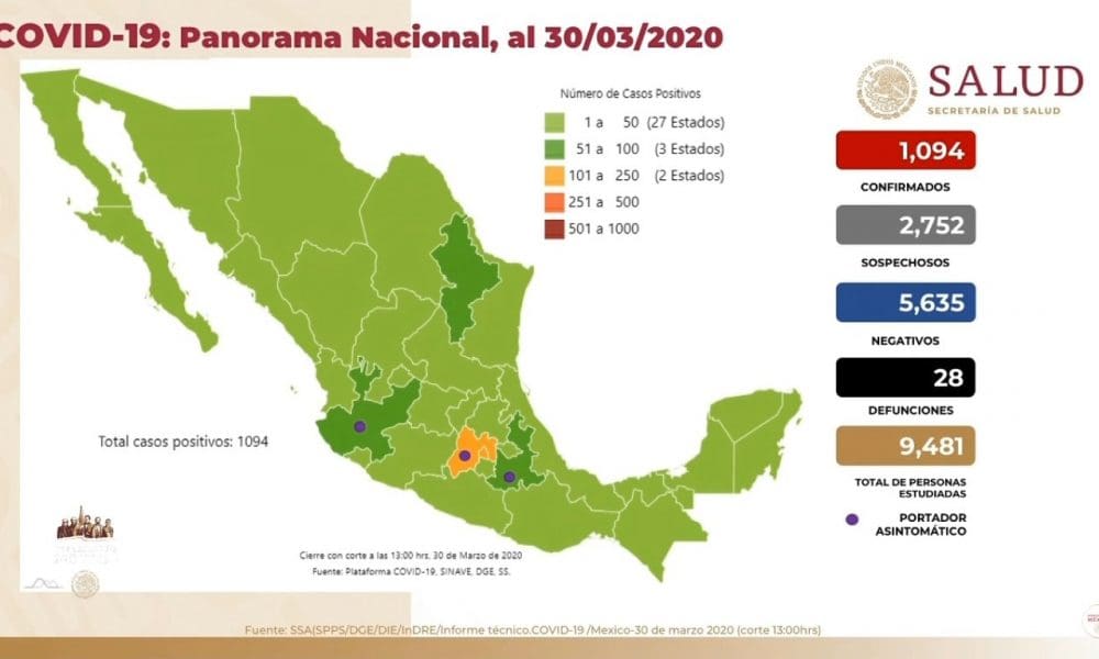 Ya van 1,094 casos confirmados de #COVIDー19 en México, lo que significa 101 casos más que ayer, según informó la Secretaría de Salud