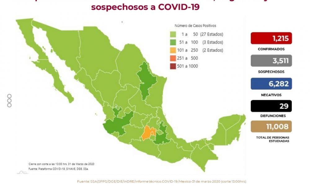 En México hasta el día de hoy se han confirmado 1,215 casos y 29 defunciones por COVID-19 en: Ciudad de México (8), Jalisco (3), Sinaloa (3),...