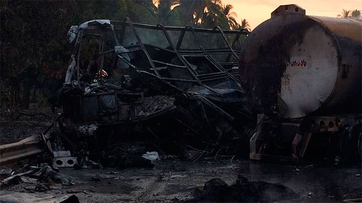 Acapulco. La Fiscalía General de Guerrero (FGE) y la Policía Federal investigan las causas del choque entre un autobús de turismo y una pipa de doble remolque...