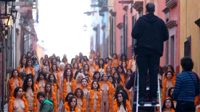 Unas 110 mujeres posaron desnudas este jueves para el fotógrafo estadounidense Spencer Tunick, quien realizó una instalación con motivo del Día de Muertos en las calles...