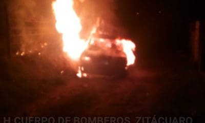 Zitácuaro Michoacán. Bomberos reportó que en la tenencia de San Miguel Chichimequillas se incendió un vehículo Nissan tipo Tsuru del servicio público de la línea Mega...