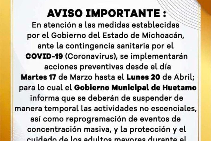 Huetamo suspende de manera temporal actividades no esenciales y eventos masivos. En atención a las medidas establecidas’; por el Gobierno del Estado de Michoacán, ante la...