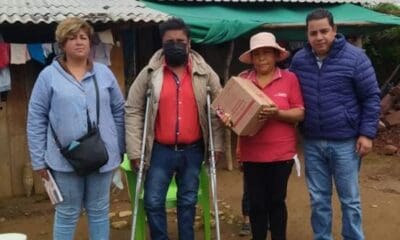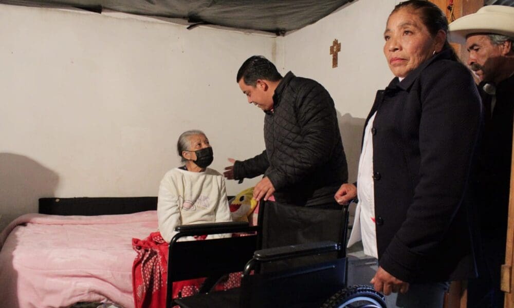 Amado Gómez entrega silla de ruedas a adulto mayor.