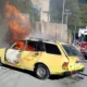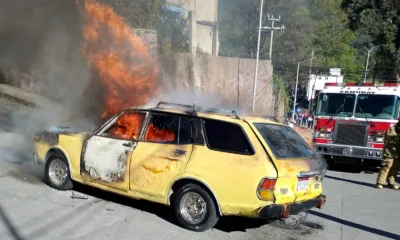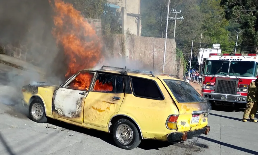 Zitácuaro, Michoacán, 30 de diciembre de 2023. Un vehículo tipo Datsun que transportaba tres tanques de gas LP se incendió esta tarde en la entrada a...
