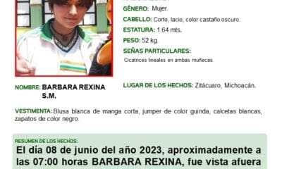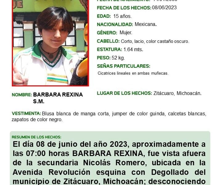 Zitácuaro, Michoacán, 9 de junio de 2023. La Fiscalía General del Estado de Michoacán activó la Alerta Amber para localizar a Bárbara Rexina S.M., una adolescente...