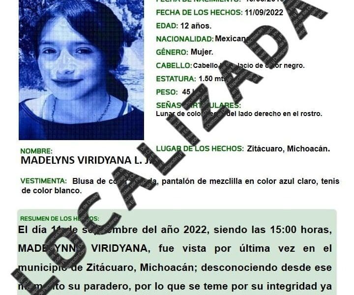 Zitácuaro, Michoacán, a 13 de septiembre de 2022.- La Fiscalía General del Estado de Michoacán (FGE) desactivó Alerta Amber tras localizar -sana y salva- a una...