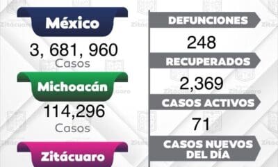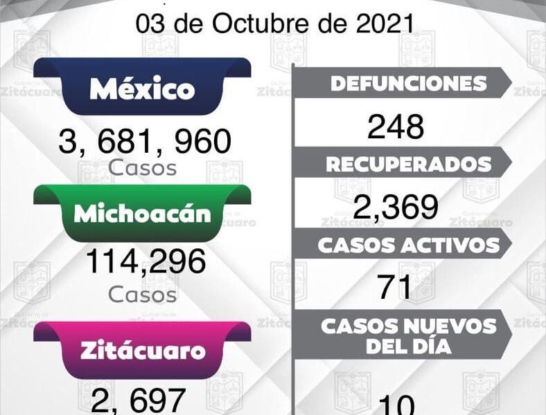 Zitácuaro Michoacán. 3-oct-2021. Autoridades Municipales reportaron hoy, 10 casos nuevos por COVID-19, hasta el momento suman 248 defunciones y 2697 casos confirmados. En el municipio haya...