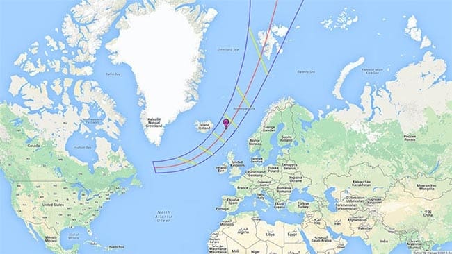 El marcador GD muestra el lugar de mayor duración del eclipse: 2 minutos y 46,9 segundos. Se ubica en el Atlántico Norte, al este de Islandia. No obstante, incluso los observadores que estén a cientos kilómetros de este teórico punto de mayor duración también podrán disfrutar del eclipse, aunque sea parcial: lo más importante es que el cielo no esté nublado, indica la NASA.