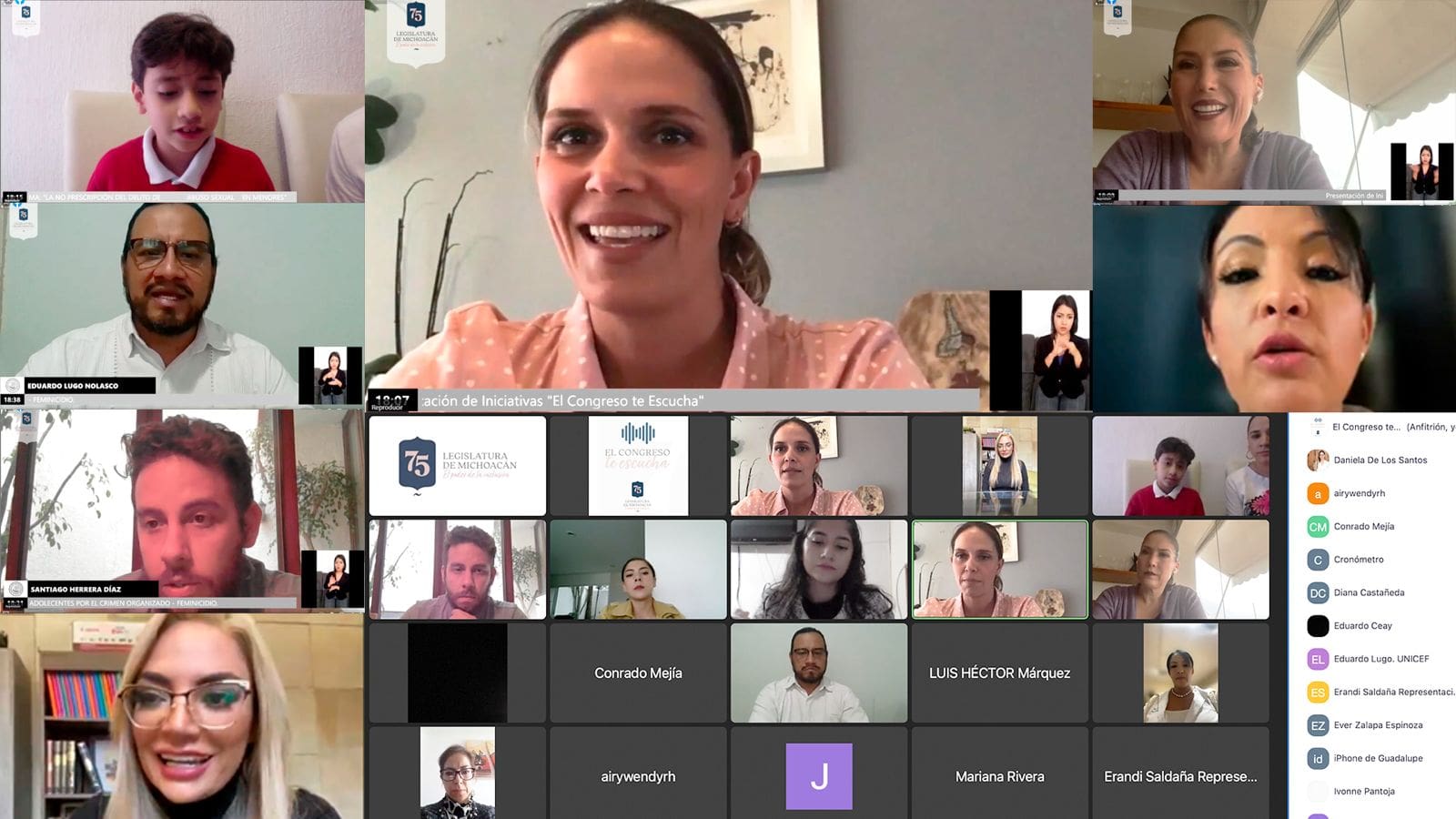 Herrera representantes de UNICEF en Michoacán, las diputadas Daniela De Los Santos Torres, presidenta del Comité de Comunicación Social, Laura Ivonne Pantoja Abascal y María Guadalupe Díaz Chagolla, ambas integrantes de la Comisión de Protección a la Niñez y la Adolescencia del Congreso del Estado, se llevo a cabo de manera virtual el IV foro El Congreso
