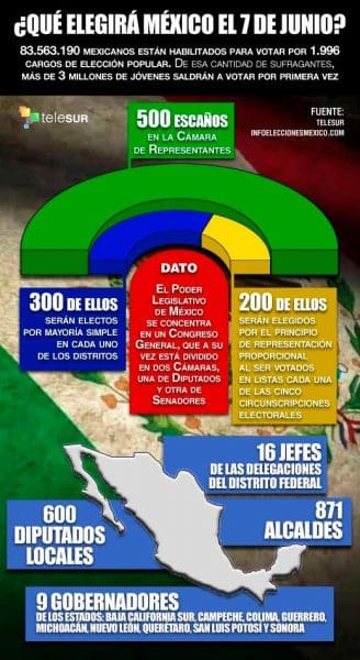 14- Participan 10 partidos políticos: Partido Acción Nacional, Partido Revolucionario Institucional, Partido de la Revolución Democrática, Partido del Trabajo, Partido Verde Ecologista de México, Movimiento Ciudadano, Nueva Alianza, Movimiento Regeneración Nacional, Partido Humanista y Partido Encuentro Social. También es relevante que serán las primeras elecciones en México donde puedan participar candidatos independientes.