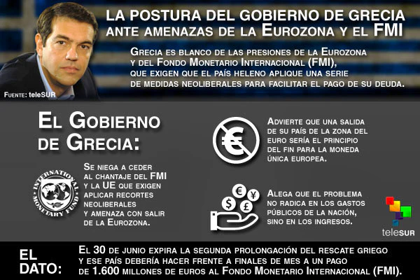 El mismo 30 de junio, fecha del fin del rescate, el ministro de Finanzas de Grecia, Yanis Varoufakis, anunció que el país no cancelará el pago pendiente al FMI. “Grecia no pagará este martes los mil 600 millones de euros que le debe al fondo”, confirmó el funcionario en declaraciones a la prensa, un día después de que la plaza Syntagma, en Atenas, se llenara de miles de personas que rechazaron las presiones de los acreedores.