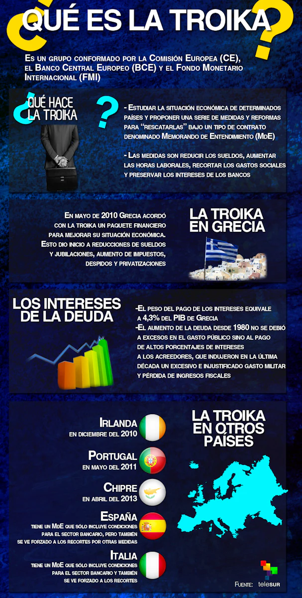 En mayo de 2010, Grecia acordó con la Troika -Fondo Monetario Internacional (FMI), Banco Central Europeo (BCE) y Comisión Europea (CE)- un paquete financiero para mejorar su situación económica. Esto dio inicio a reducciones de sueldos y jubilaciones, aumento de impuestos, despidos y privatizaciones.