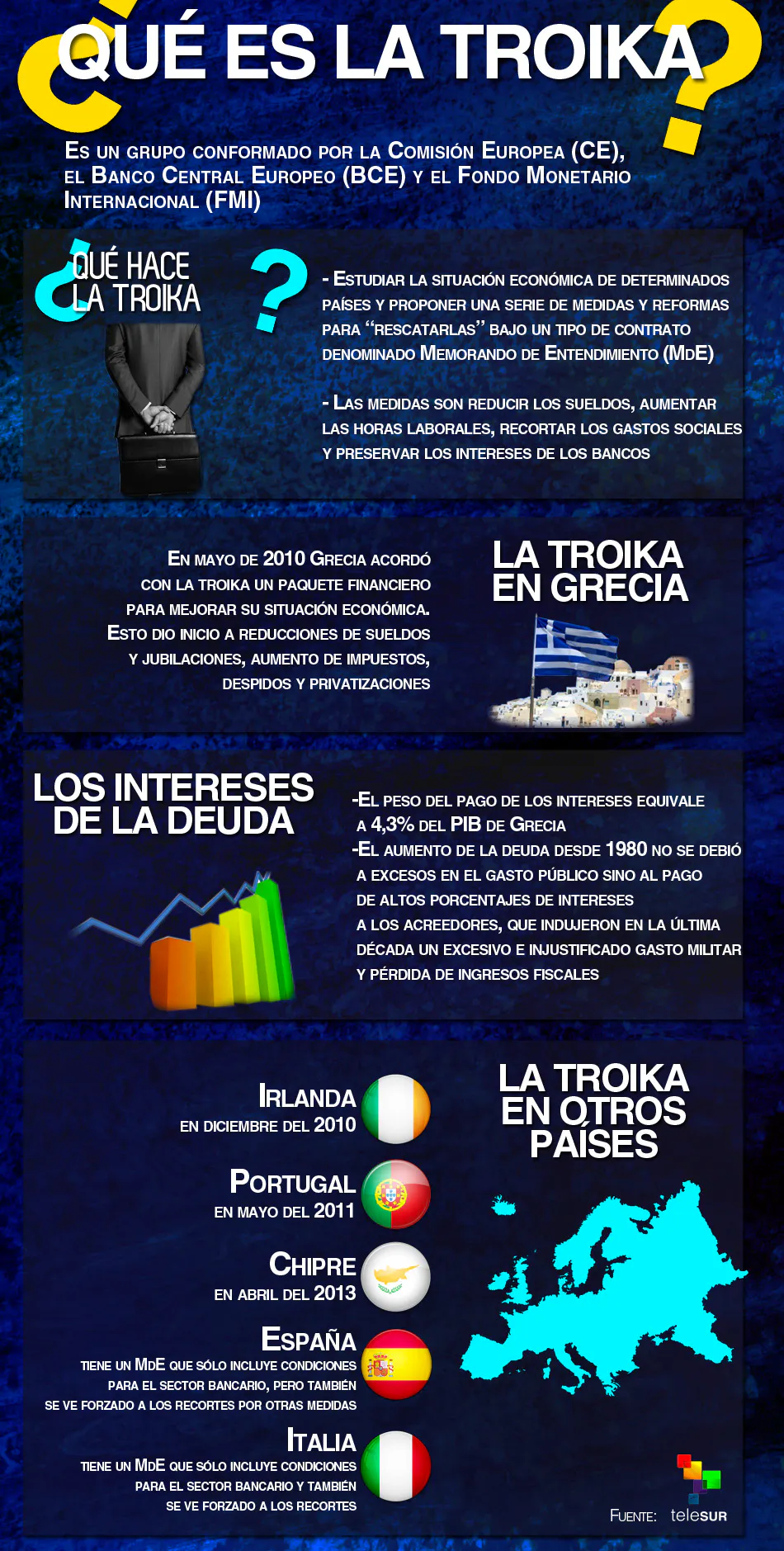 En mayo de 2010, Grecia acordó con la Troika -Fondo Monetario Internacional (FMI), Banco Central Europeo (BCE) y Comisión Europea (CE)- un paquete financiero para mejorar su situación económica. Esto dio inicio a reducciones de sueldos y jubilaciones, aumento de impuestos, despidos y privatizaciones.