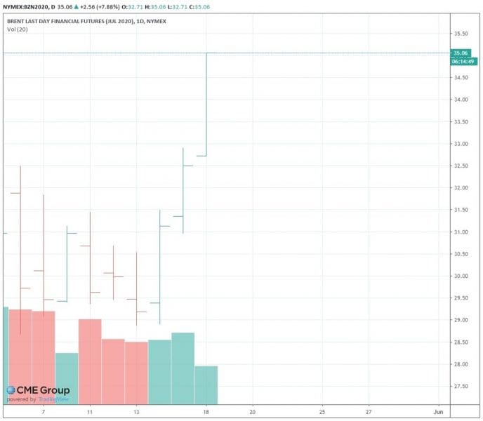 De acuerdo con los datos de la bolsa NYMEX, alrededor de a las 14:40 (GMT) de este lunes, el precio de los futuros de este crudo europeo ha superado los 35,06 dólares estadounidenses, lo que representa un aumento de del 7,88 % en comparación con el precio de la apertura de sesión.