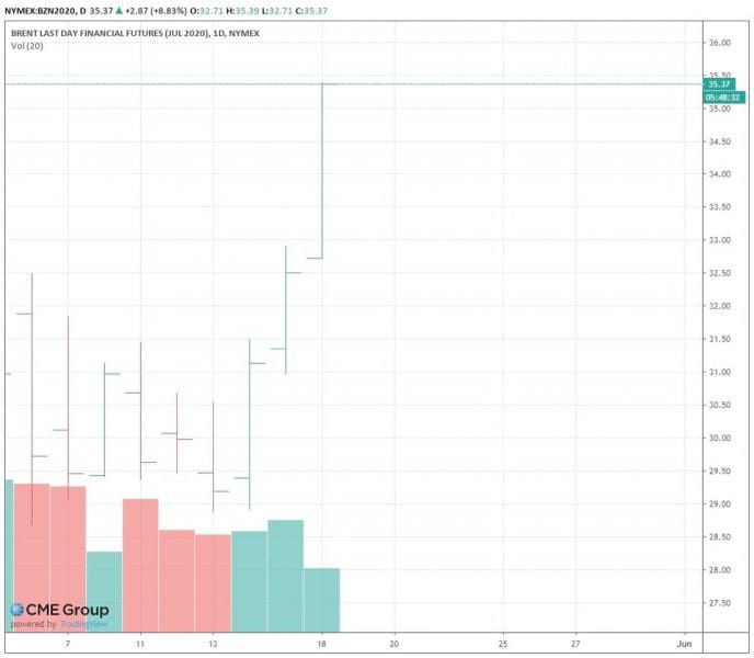 Los precios de los futuros para junio del crudo Brent están en tendencia alcista y este 18 de mayo se han elevado por encima de los 35 dólares el barril por primera vez desde el pasado 2 de abril.