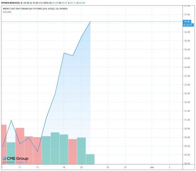 Así, el precio de los futuros para julio del crudo europeo de referencia internacional Brent, que se ha situado en 35,80 dólares a la hora de la apertura de la sesión, se ha elevado más del 2,3% en lo que va de esta jornada, alcanzando su punto máximo en 36,87 dólares.