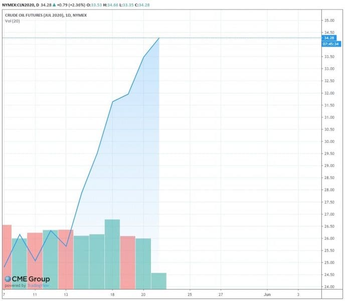Por su parte, el precio de los futuros para julio del crudo estadounidense WTI también está ganando puntos, y en lo que va de esta jornada ha subido más del 2,3%.Para las 13:15 (GMT), ha alcanzado un máximo de 34,66 dólares, tras arrancar en 33,53 en la apertura de la sesión.