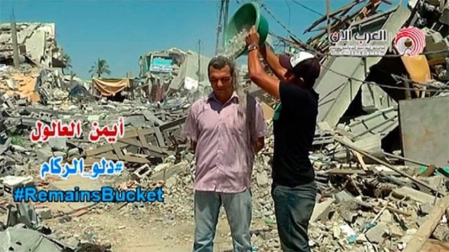 El periodista palestino Ayman Aloul ha subido a YouTube un video donde hace un llamamiento mundial para emprender su campaña ‘del cubo de escombros’. Según ha explicado, a él le encanta la idea de la campaña del cubo de hielo, pero debido a los constantes bombardeos de las Fuerzas de Defensa de Israel, los palestinos en Gaza no tienen suficiente agua, y ni mucho menos hielo debido a los cortes de electricidad.