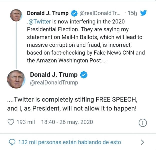 Tras el reciente notificación de verificadores de datos de Twitter, que sostienen que son falsas las afirmaciones del presidente de EE.UU., Donald Trump, al alegar en dos tuits que las papeletas de votación por correo serán “sustancialmente fraudulentas”, el mandatario acusó este martes a la red social de reprimir la “libertad de discurso”.