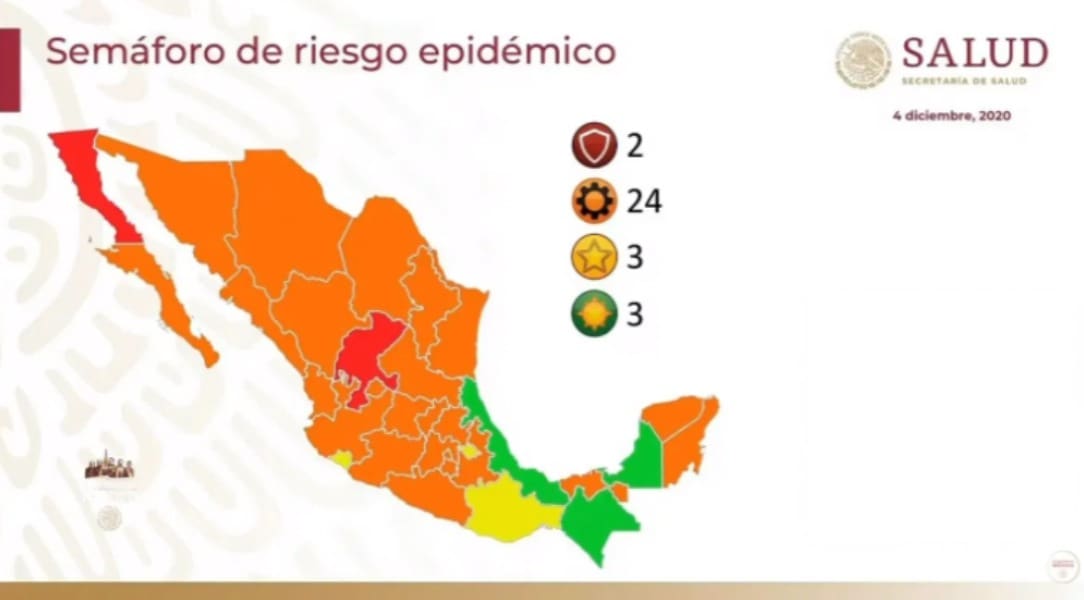 A partir del 7 de diciembre y durante los próximos 15 días, dos estados se mantendrán en color rojo, 24 en color naranja, 3 en color amarillo y tres en verde del Semáforo de Riesgo Epidemiológico por COVID-19, informó la Secretaría de Salud.