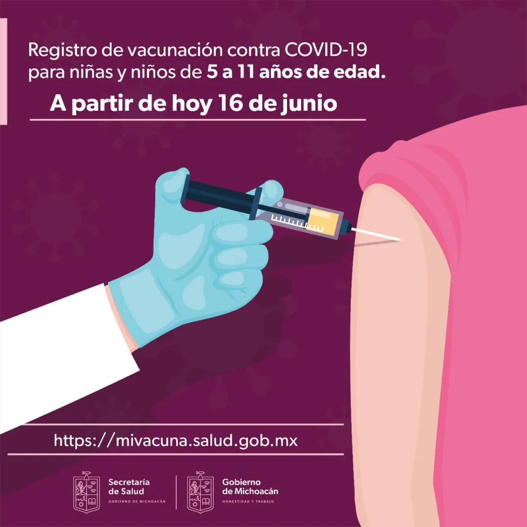 Morelia, Michoacán, a 16 de junio de 2021.- El registro de vacunación contra COVID-19 para niñas y niños de 5 a 11 años de edad en Michoacán ya abrió este jueves 16 de junio, a través de la plataforma https://mivacuna.salud.gob.mx.