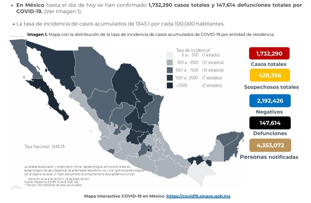 Al 22 de enero de 2021 hay 1,291,940 personas recuperadas de #COVID19. Hay 1,732,290 casos confirmados y 2,192,426 negativos. Se han registrado 147,614 defunciones confirmadas.