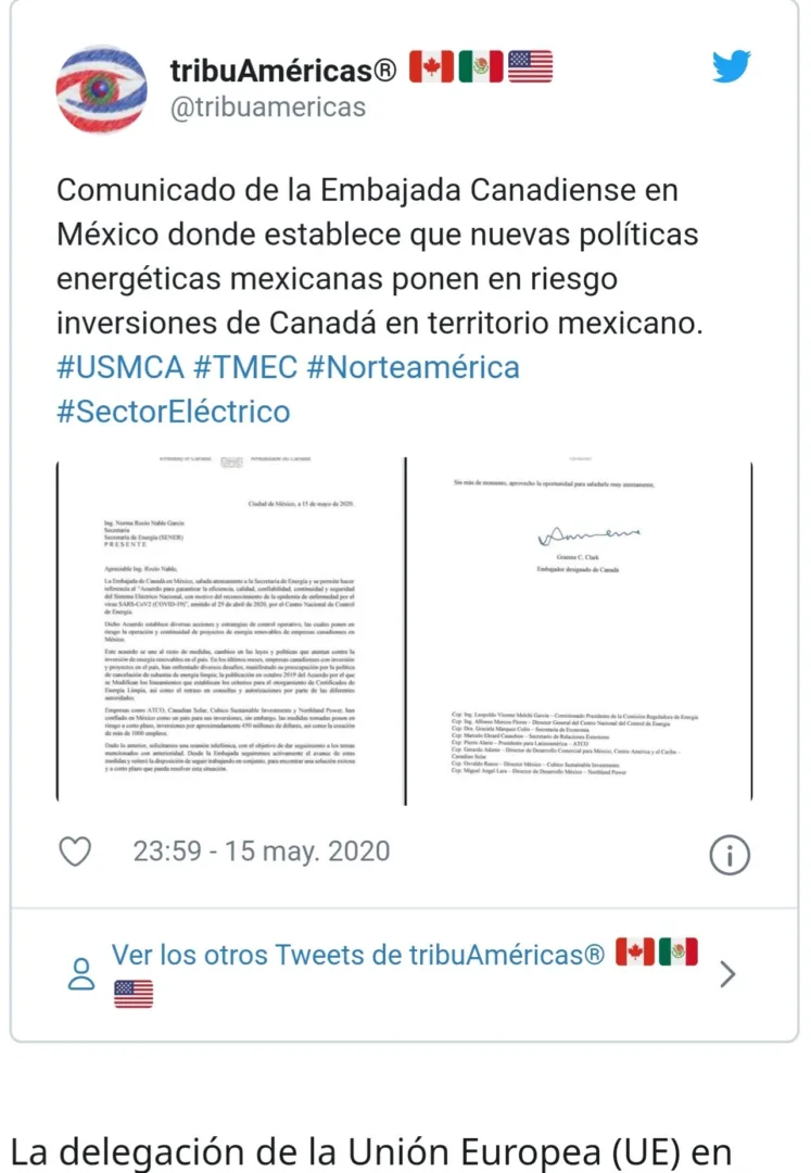 La Embajada de Canadá en México alertó que la entrada en vigor del acuerdo pone en riesgo inversiones canadienses por 450 millones de dólares. En una carta dirigida la secretaria de Energía, el embajador canadiense Graeme Clark, señaló que la implementación de esta nueva política energética altera la operación y continuidad de proyectos de energías renovables de empresas canadienses en el país.