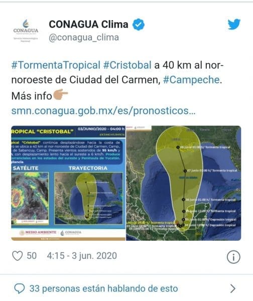 En el momento en que se emitió dicho reporte, Cristóbal, que se formó este martes a partir de la depresión tropical Tres en el golfo de México, se encontraba 40 kilómetros al noroeste de Ciudad del Carmen, estado de Campeche, desplazándose a 6 kilómetros por hora hacia el sur con vientos máximos sostenidos de 95 kilómetros por hora.