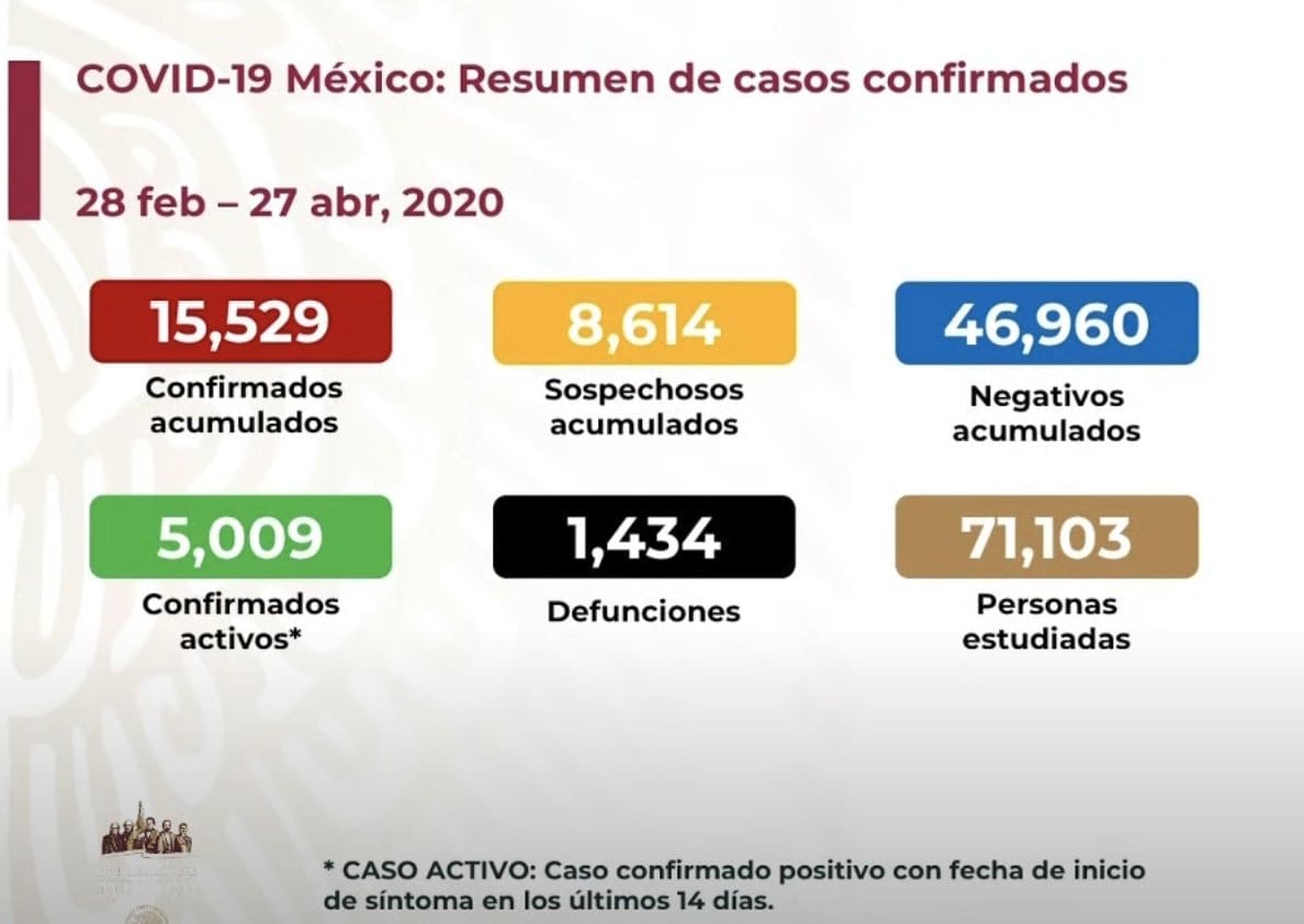 Informó que las cifras nacionales son de 15 mil 529 #CasosConfirmados del #coronavirus y 1,434 defunciones, y 5009 confirmados activos en los últimos 14 días.