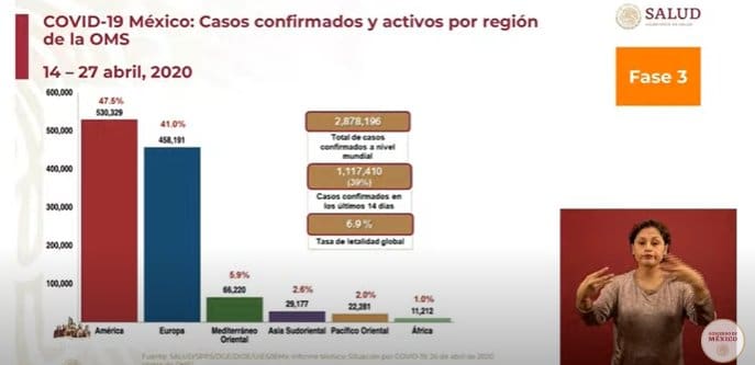 El dr. José Luis Alomía, director general de Epidemiología, informó que el total de casos confirmados a nivel mundial es de 2, 878,196 y con una tasa de letalidad del 6.9%.