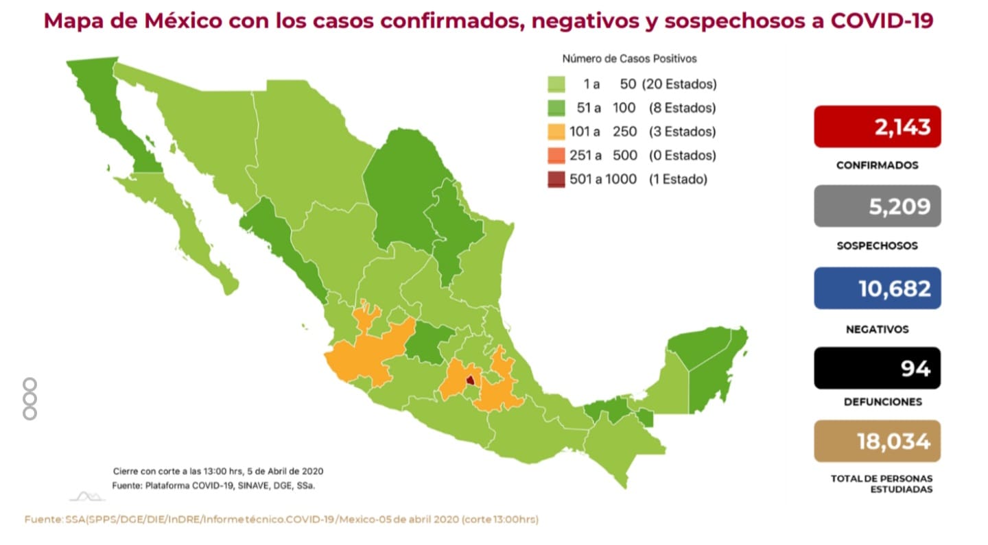 México registra 94 muertos y 2,143 casos positivos de COVID19