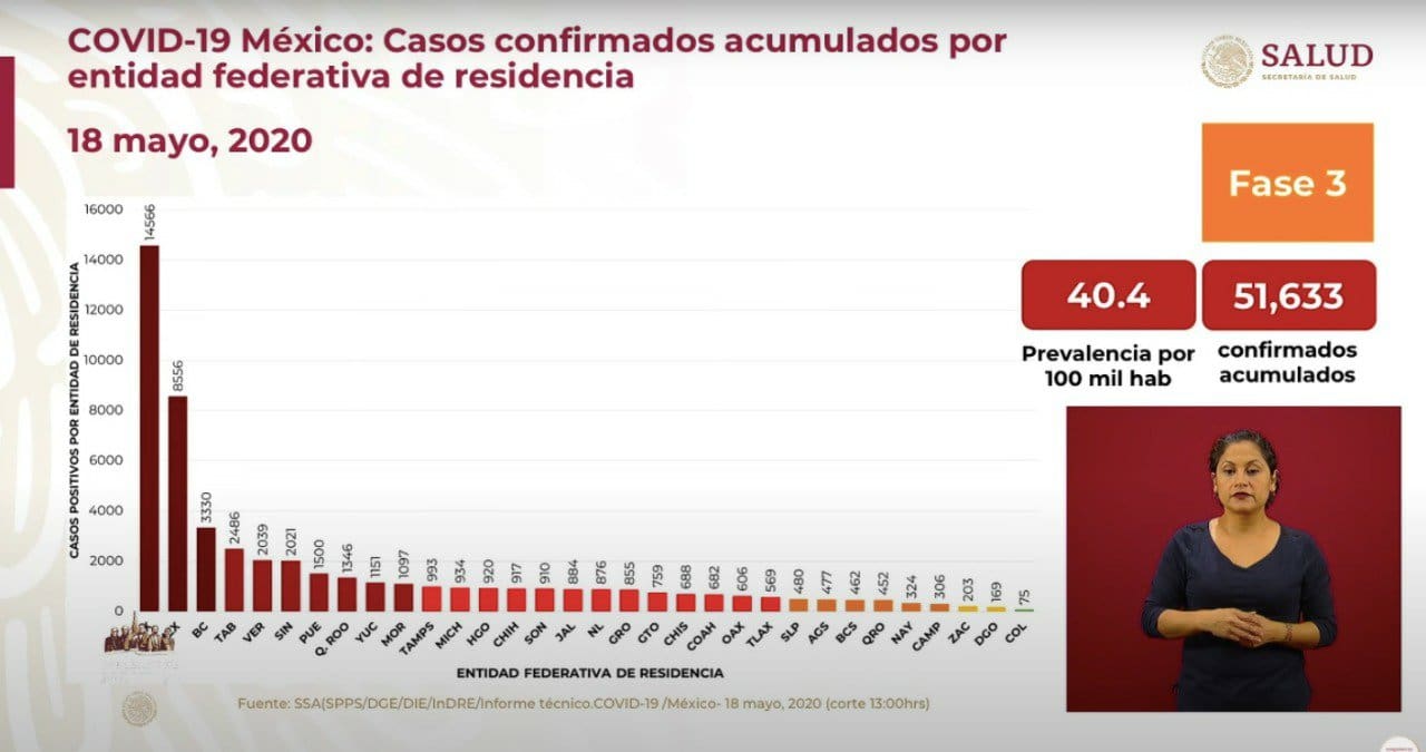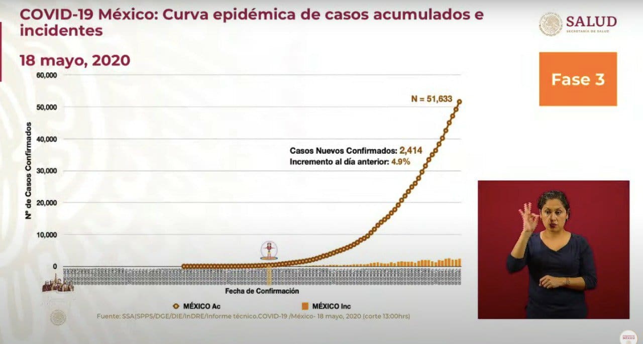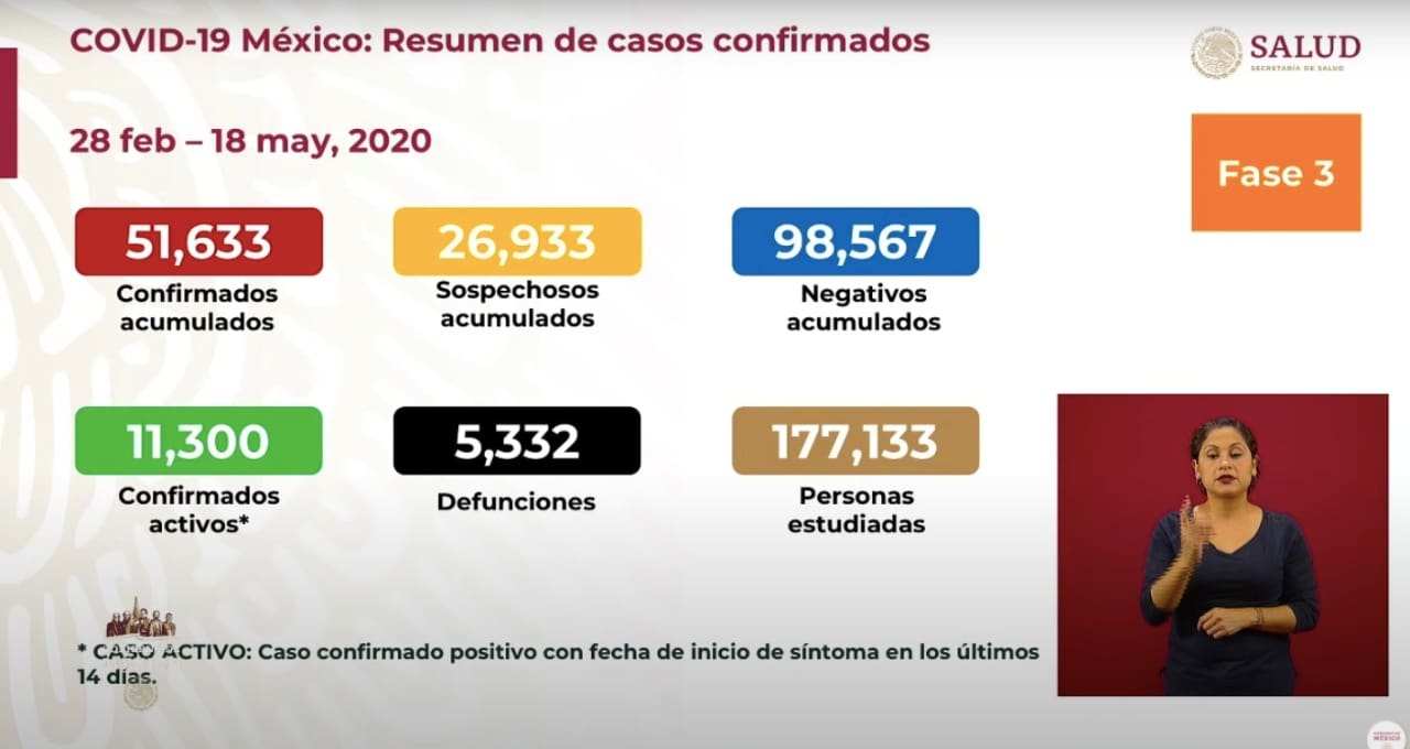 En #México, hay un total de 51, 633 casos confirmados del coronavirus, 11,300 casos activos y 5,332 defunciones, dijo HugoLópez-Gatell, subsecretario de Salud.