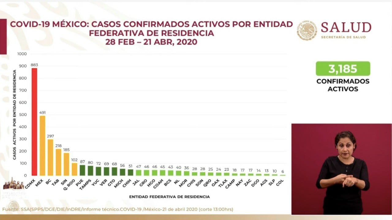 José Luis Alomía presentó la distribución de los casos confirmados activos por entidad federativa de residencia; destaca la CDMX con 883 casos.