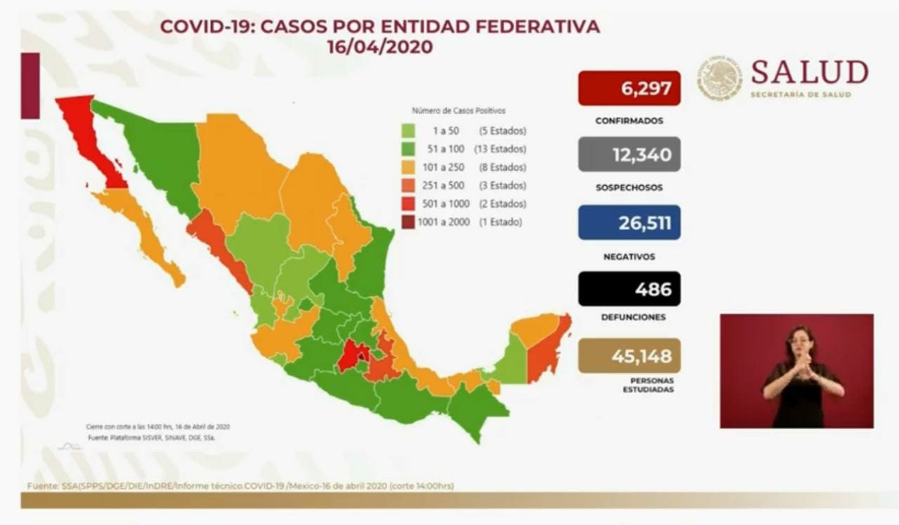 México reporta ya 6 mil 297 casos confirmados de coronavirus, 12 mil 340 sospechosos, 25 mil 511 negativos y 486 defunciones. Al día de hoy, 45 mil 148 personas han sido estudiadas en México por síntomas de #COVID19.