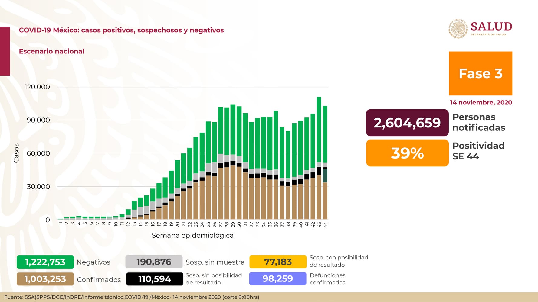 Según el informe de las autoridades sanitarias, en las últimas 24 horas se registraron 5.860 nuevos casos de covid-19 y 635 fallecimientos. Hasta el viernes 13 de noviembre, México contabilizaba 997.393 positivos a covid-19 y 97.624 muertes.