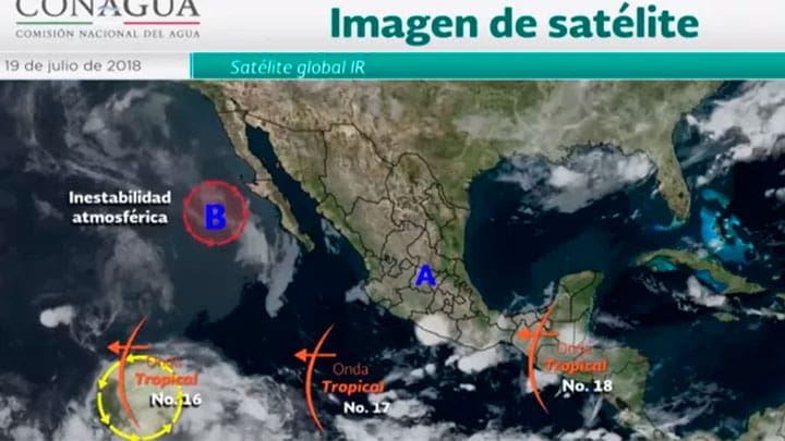 En cuanto a lluvias, reportó que la onda tropical número 17, que se localizará al suroeste de las costas de Jalisco, y la Número 18, a su paso por la Península de Yucatán, ocasionarán tormentas puntuales muy fuertes en Veracruz, Oaxaca y Chiapas.