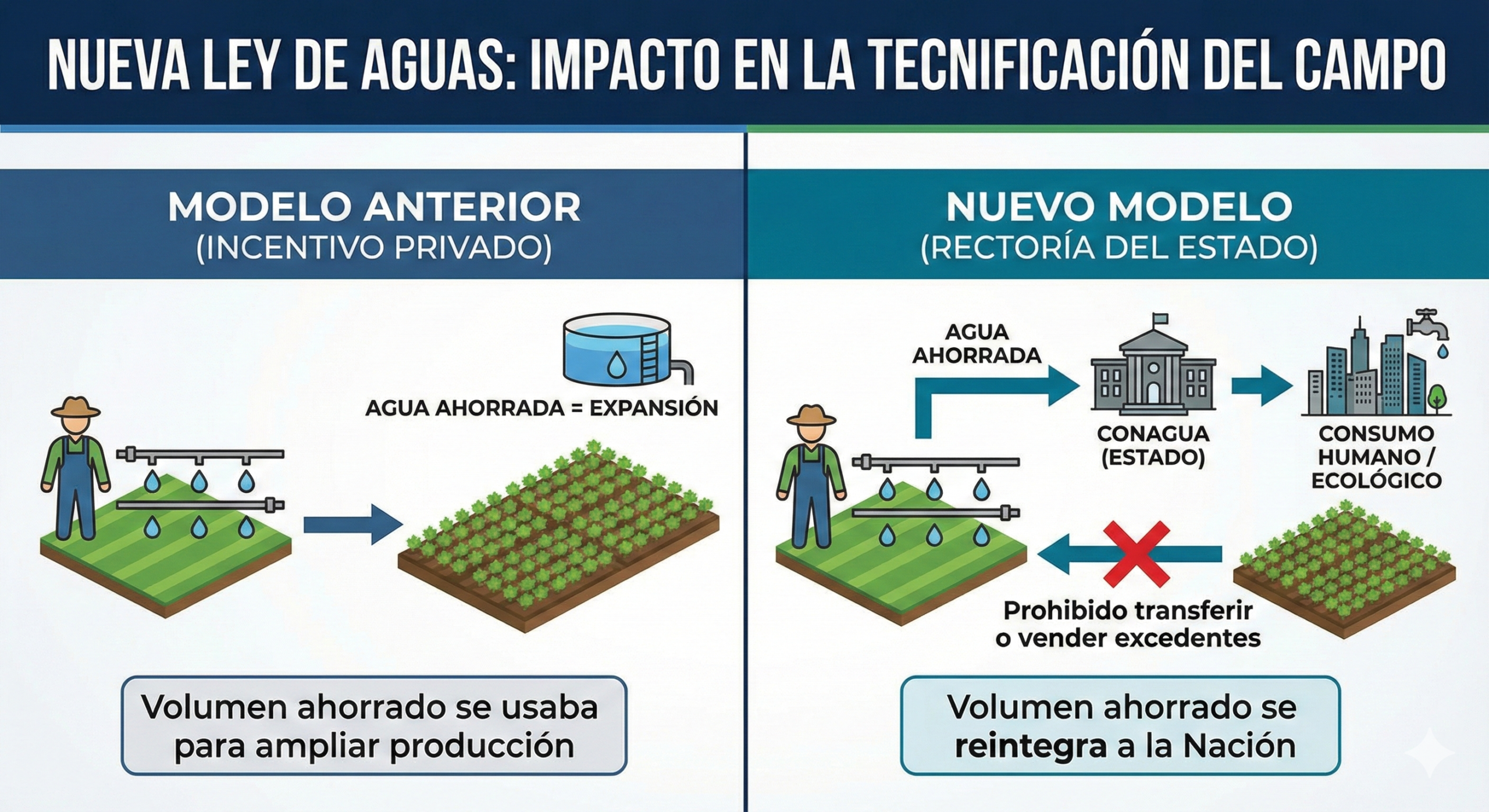 La Nueva Ley: La reforma establece que los volúmenes de agua ahorrados mediante la tecnificación —especialmente aquella financiada con recursos públicos— deberán reintegrarse a la Comisión Nacional del Agua (Conagua).