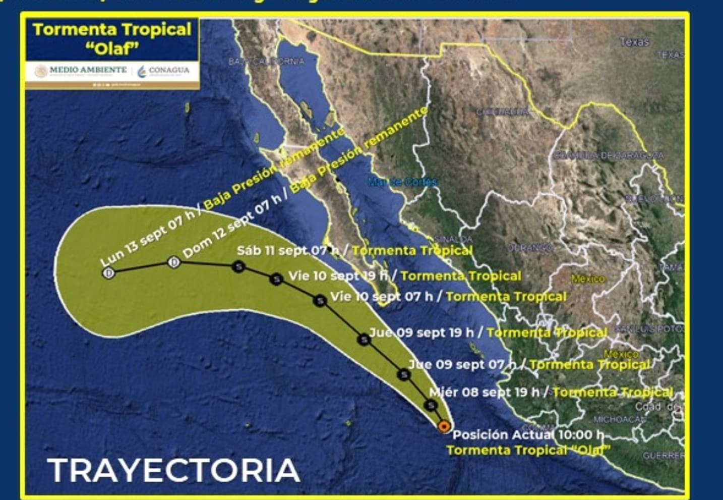 La Depresión Tropical “Quince-E’ se ha intensificado a la Tormenta Tropical “Olaf, su centro se localiza a 255 km al