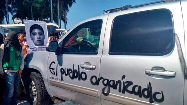 Una marcha por Ayotzinapa cerca la camioneta del alcalde de Acapulco en la carretera