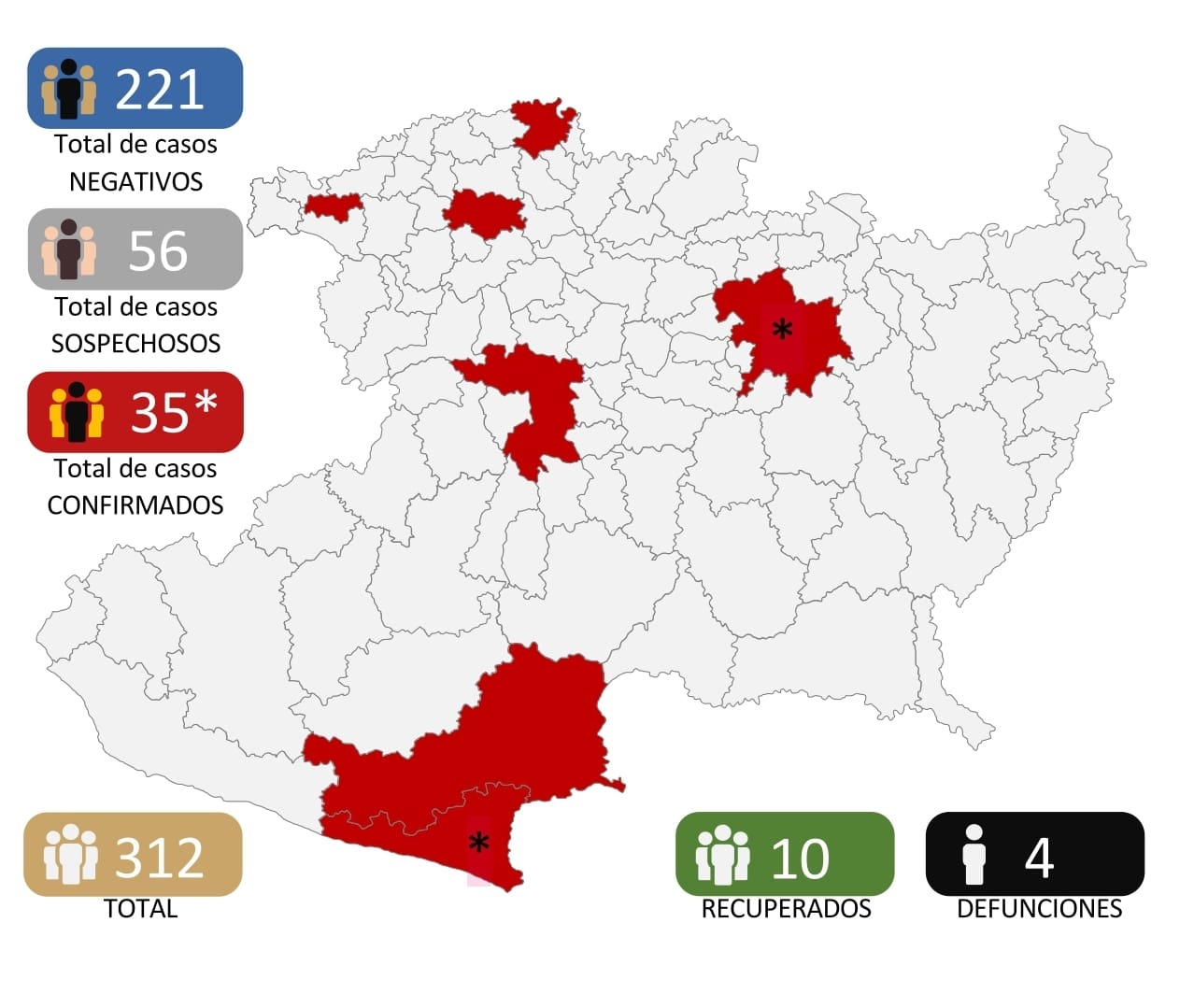 • El día de hoy se presentan dos defunciones más de pacientes positivos a COVID-19, siendo un total de CUATRO defunciones en la entidad.