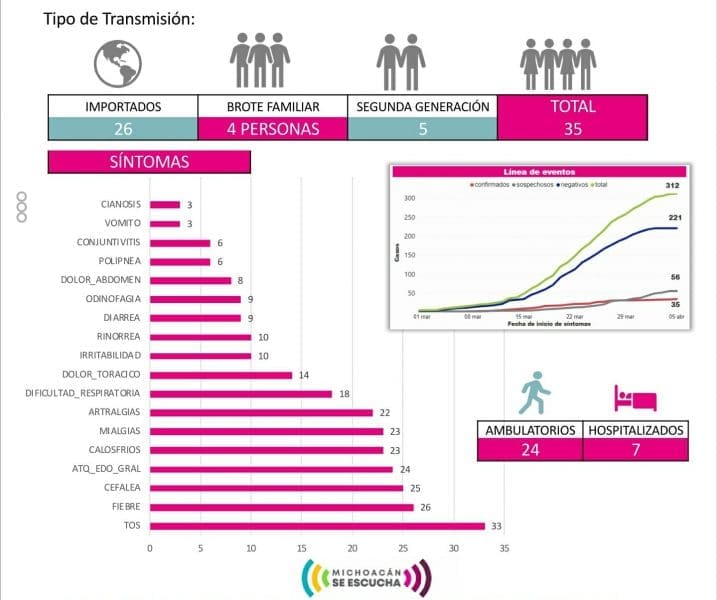 Hasta el momento: 35 casos se han confirmado en el Estado de Michoacán, VEINTIDÓS en Morelia, UNO en Zamora, DOS en Uruapan, UNO en La Piedad, UNO en Sahuayo, UNO en La Huacana, UNO en Arteaga y SEIS en Lázaro Cárdenas.