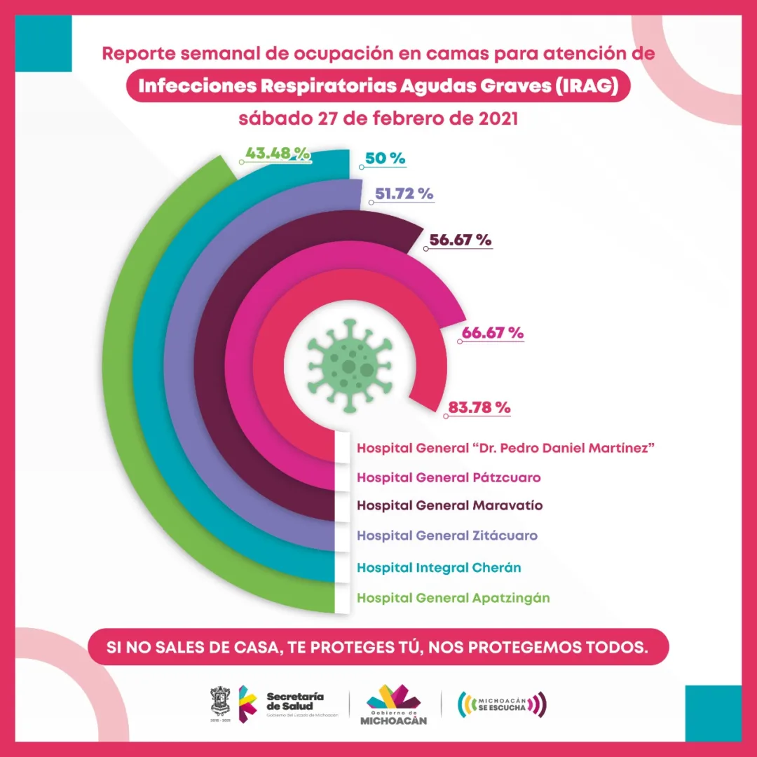Morelia, Michoacán, a 27 de febrero de 2021.- Los hospitales con camas reconvertidas para la atención de Infecciones Respiratorias Agudas Graves (IRAG), de la Secretaría de Salud de Michoacán (SSM), registran una baja en comparación a enero, donde se rebasaba casi a diario la ocupación hospitalaria.