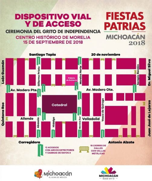 Para la conmemoración del Grito de Independencia, se realizarán cortes a la circulación vehicular, iniciando en la Avenida Madero en sus cruces con Quintana Roo y León Guzmán, así como Miguel Silva y Juan José de Lejarza; además de las calles Santiago Tapia, 20 de Noviembre en su cruce con Serapio Rendón; Antonio Alzate esquina con Juan José Lejarza, y Corregidora en su cruce con Quintana Roo, donde serán instaladas 19 vallas metálicas para impedir el paso de vehículos.