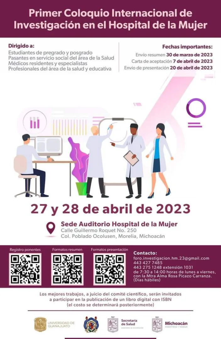 *Morelia, Michoacán, 21 de marzo de 2023.-* El Hospital de la Mujer, de la Secretaría de Salud de Michoacán (SSM), invita a estudiantes de pregrado y posgrado, pasantes en servicio social del área médica, residentes y profesionales de la salud, a participar en su primer Coloquio Internacional de Investigación, que se realizará del 27 al 28 de abril.