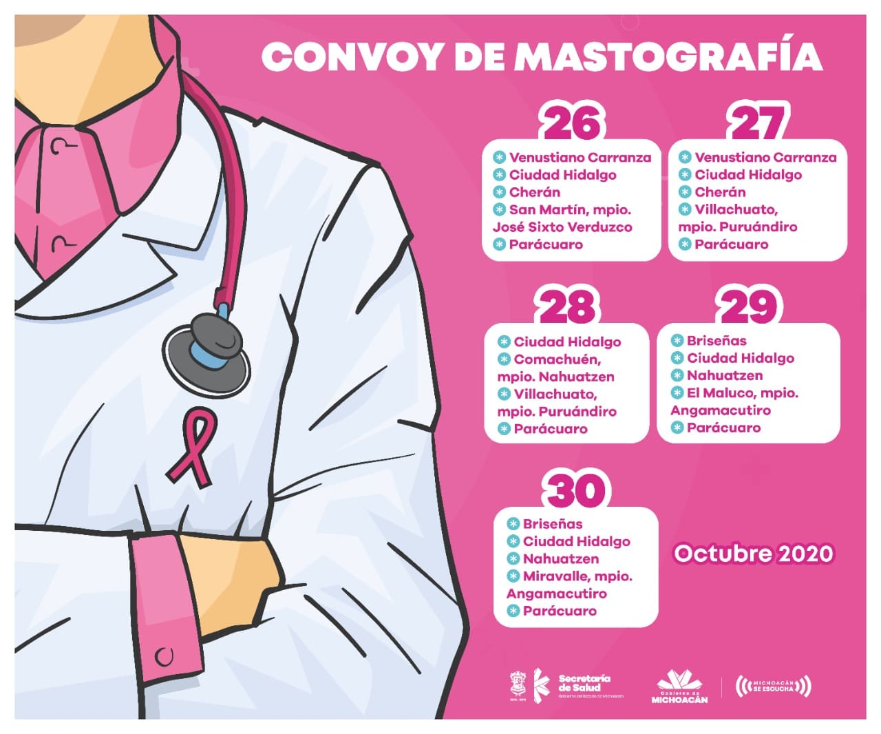 Del 26 al 30 de octubre se programaron estas unidades para visitar los municipios de Venustiano Carranza, Ciudad Hidalgo, Cherán, Puruándiro, José Sixto Verduzco, Briseñas, Nahuatzen, Angamacutiro y Parácuaro
