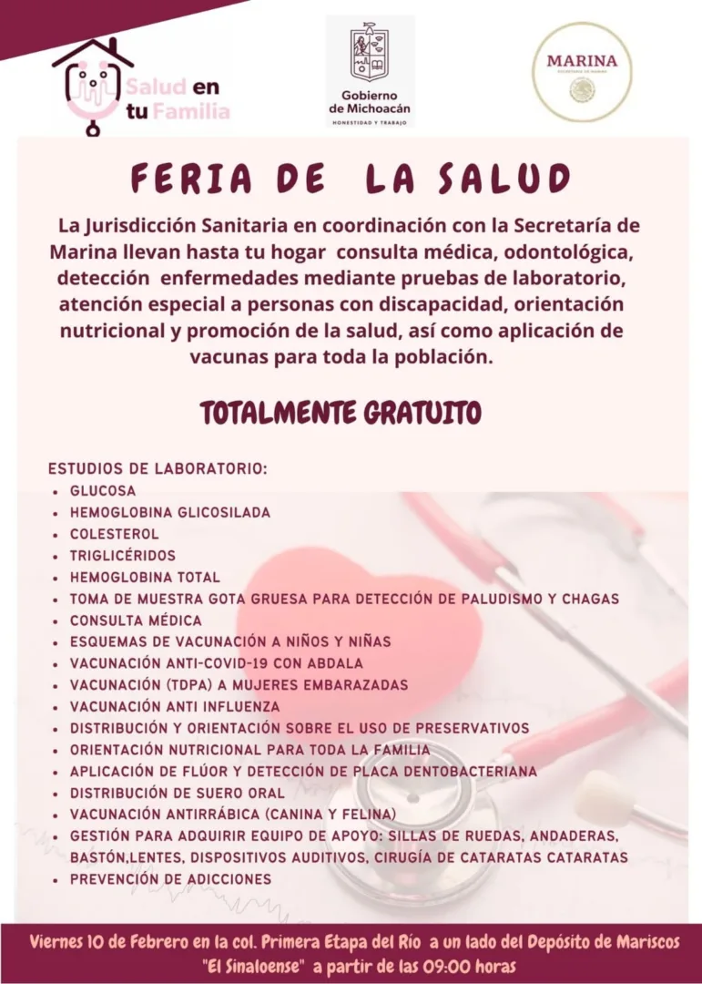 Morelia, Michoacán, 6 de febrero de 2023.- Con el propósito de llevar a la población servicios médicos gratuitos y oportunos, la Secretaría de Salud de Michoacán (SSM), a través del programa Salud en tu Familia, llevará a cabo el próximo 10 de febrero la Feria de la Salud en el municipio de Lázaro Cárdenas.