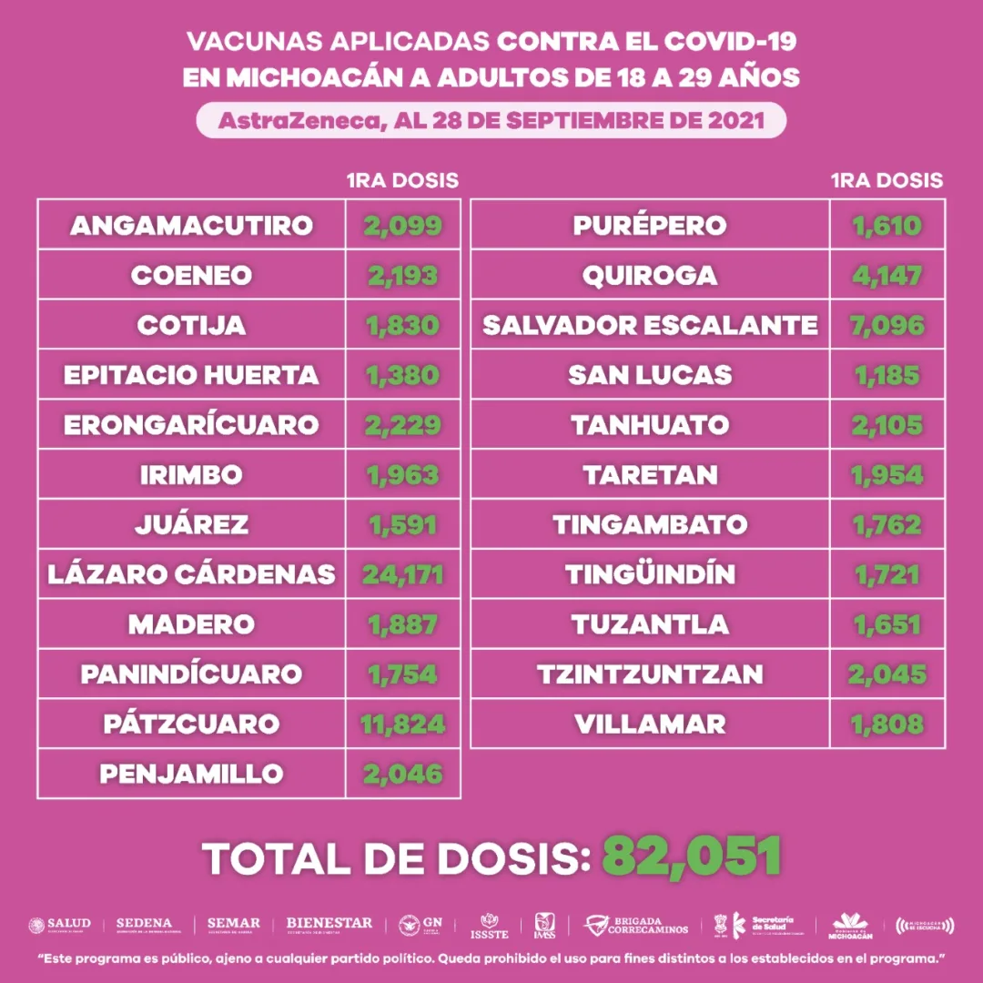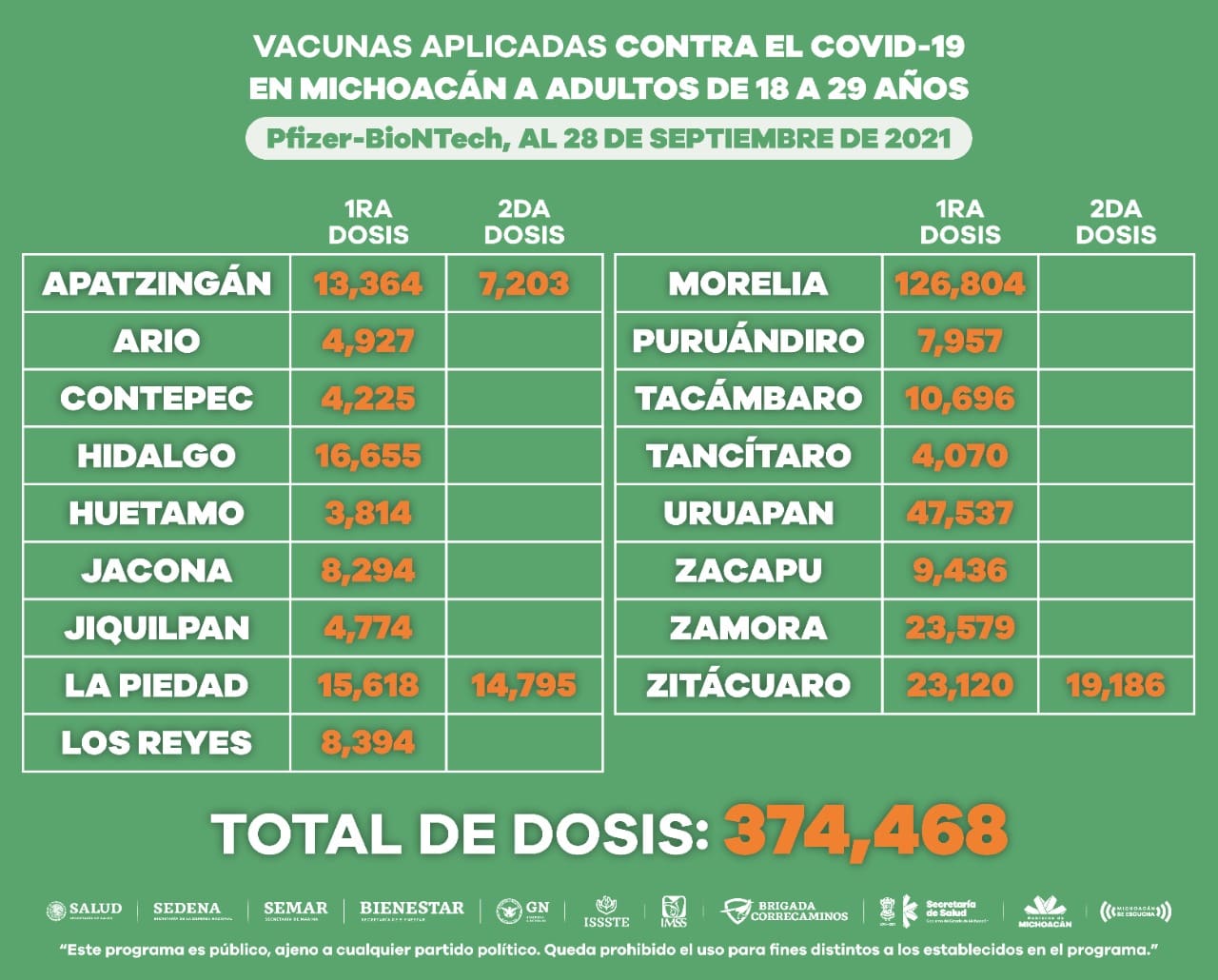 Morelia, Michoacán, a 28 de septiembre de 2021.- En Michoacán se han aplicado 574 mil 323 dosis de vacuna anti COVID-19, en beneficio de la población de 18 a 29 años. Actualmente se mantienen activos siete puestos de vacunación distribuidos en cinco localidades.
