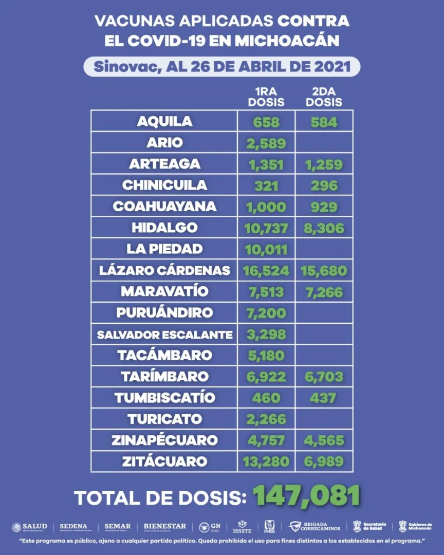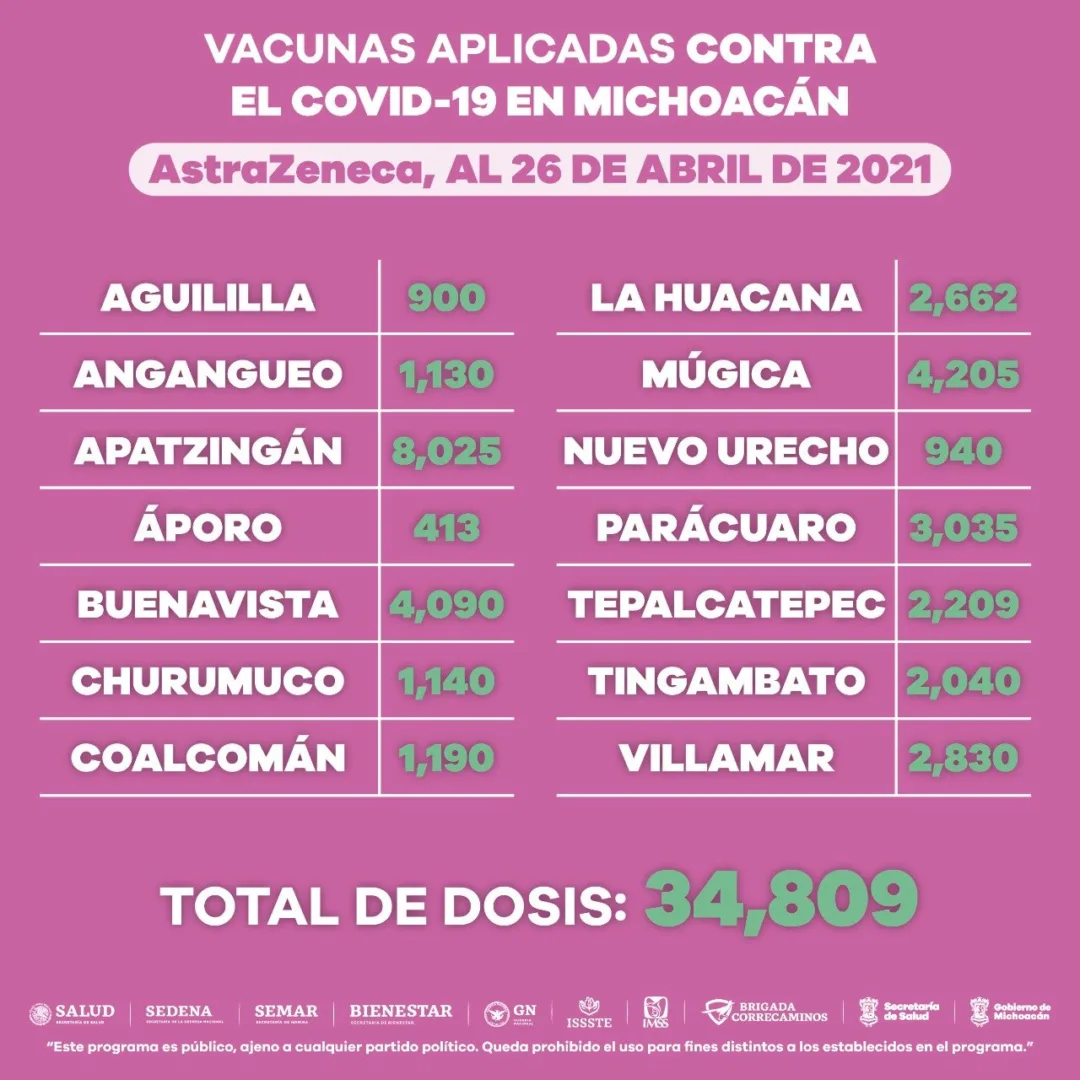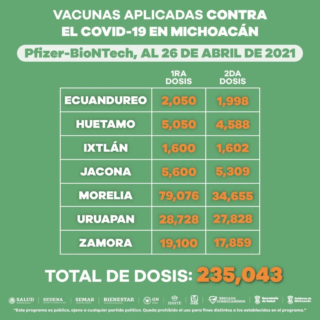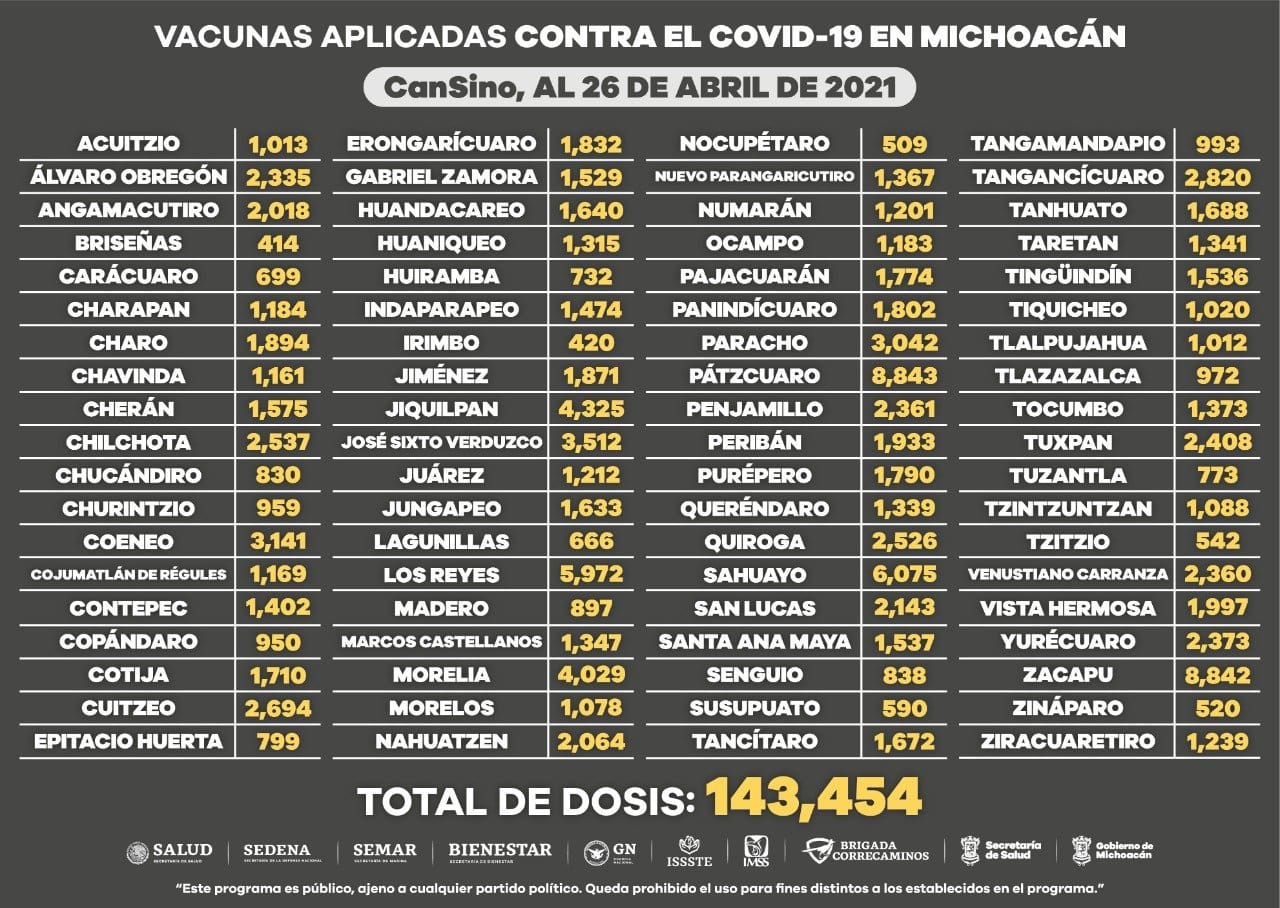 Morelia, Michoacán, a 26 de abril de 2021.- En los 113 municipios de la entidad se han aplicado 560 mil 387 dosis de vacuna anti COVID-19 a adultos mayores de 60 años, informa la Secretaría de Salud de Michoacán (SSM).
